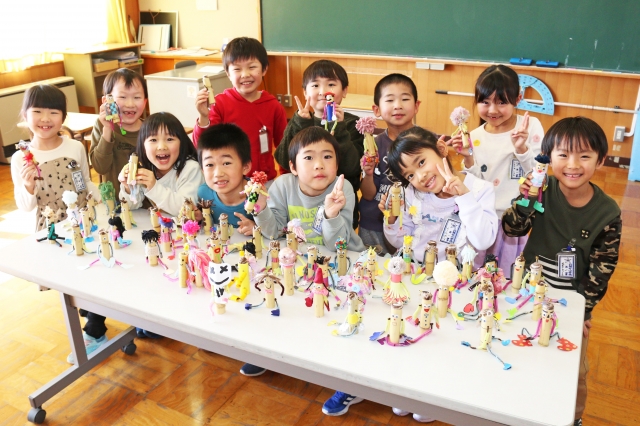「月ほたる運動」で制作した竹人形と初めて活動した北鯖石小の1年生 (2021/02/22)