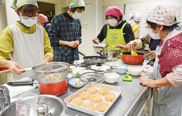 笠島のエゴ草などを使った地産地消の料理講座。サケのハンバーグやのっぺも作った=23日、市民プラザ
