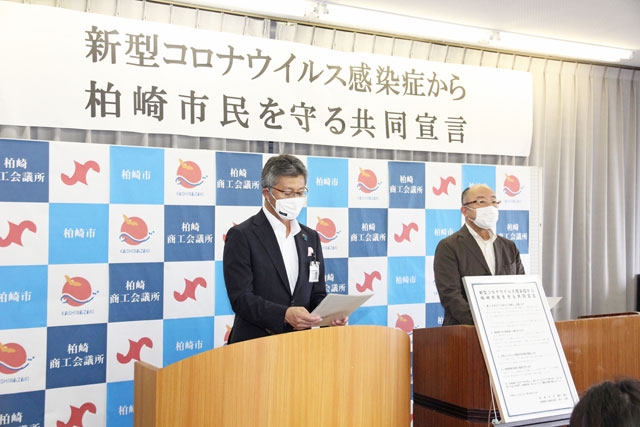 「新型コロナウイルス感染症から柏崎市民を守る」とした「共同宣言」を行う桜井市長と西川会頭=24日、市役所大会議室