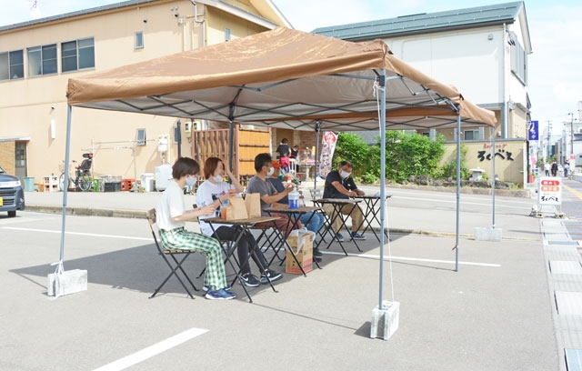 新しい形のイベント「えんまテラス」。広くきれいになった歩道などで楽しんだ=27日、市内東本町2