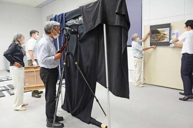 市展のWEB展示場に向け、作品を写真に収める作業を行った伊部さん(右から2人目)、坂田さん(同3人目)=14日、ソフィアセンター