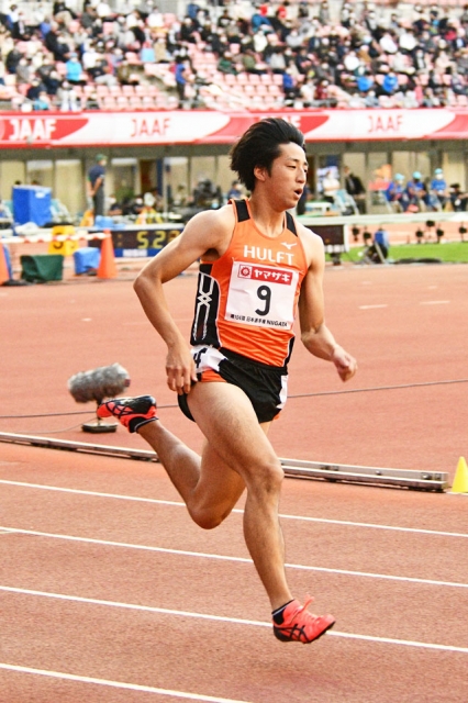 陸上の日本選手権男子400メートル予選に出場した若林康太選手=1日、新潟市中央区のビッグスワン