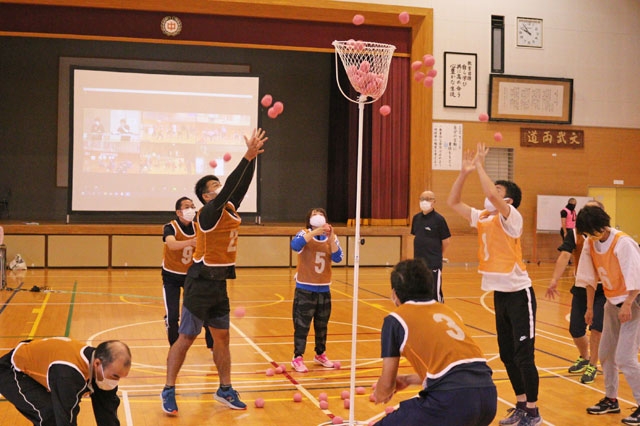 初めて行われたウェブ運動会。各会場の競技の様子が中継でスクリーンに映し出された=4日、鏡が沖中