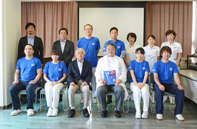 結成10周年記念のTシャツを贈ったブルボンウォーターポロクラブ柏崎の横関副理事長と、相田院長ら=市内北半田2、柏崎総合医療センター