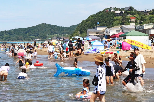 今夏初の猛暑日に、海水浴を楽しむ家族連れら=10日午前、石地海水浴場