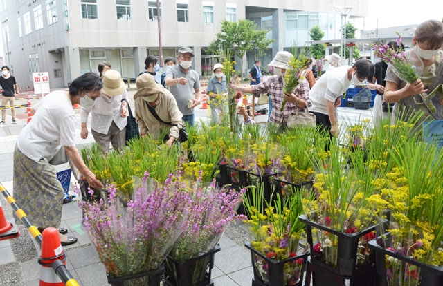 3密を避けながら、250年の伝統をつないだ花市=11日午後4時過ぎ、市民プラザ前