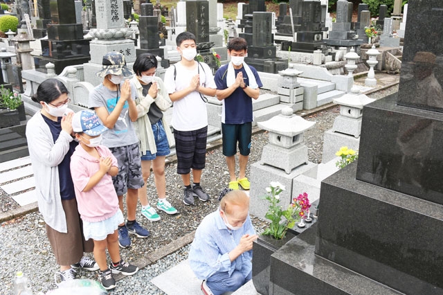 「お盆の入り」を迎え、先祖の墓前で手を合わせる家族=13日午前、市内堀