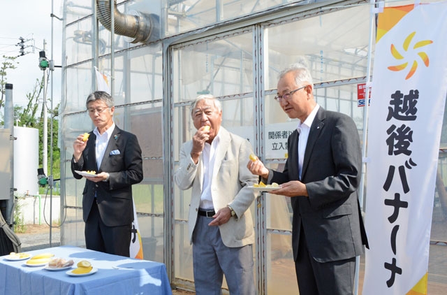 桜井市長を迎えた「越後バナーナ」の試食会。皮までガブリと味わった=18日午前、市内荒浜2のシモダ・ファーム