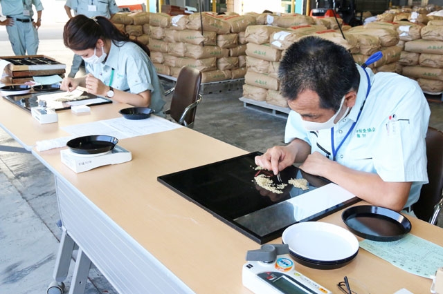 「葉月みのり」の初検査。充実度・粒張りともに良好で、高品質を評価した=19日午前、市内平井の柏崎農協ライスターミナル