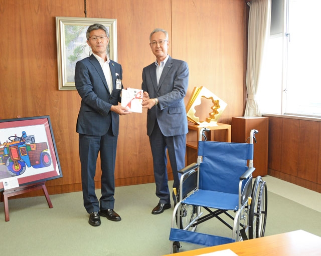 車椅子寄贈の目録を桜井市長に手渡した小出理事長(右)=23日、市役所市長応接室 (2020/06/24)