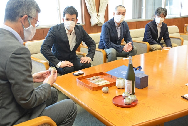 コラボ3種セットを桜井市長にお披露目する原さん(左から2人目)と河谷さん(右から2人目)、西巻さん=24日、市役所市長応接室 (2020/06/25)