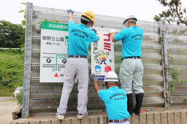 ごみ持ち帰りを呼び掛ける看板の取り付けを行う県建設業協会柏崎支部青年部会=30日、東の輪海水浴場 (2020/06/30)