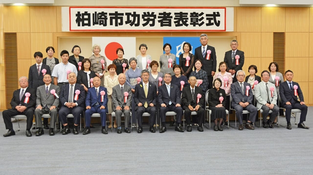桜井市長らと記念撮影をする本年度の市功労者表彰を受けた人たち=1日午前、市民プラザ (2020/07/01)