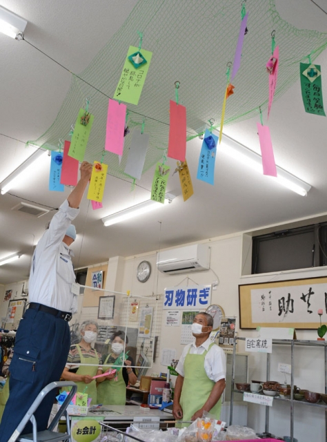 復興への感謝、新型ウイルスの収束を願い、短冊が飾られた「七夕」=3日午前、市内東本町2のやまゆり (2020/07/03)