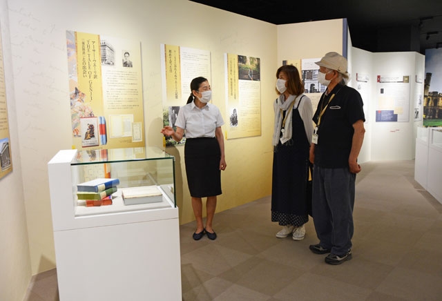 常設展示室「日本文学研究の原点」で説明する吉田理事(左)=市内諏訪町、キーン・センター柏崎 (2020/06/16)