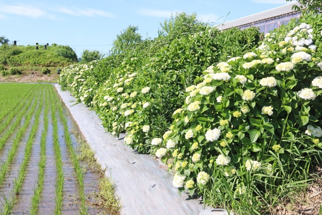 色とりどりのアジサイの花が咲き始めた水田斜面=17日、市内南条 (2020/06/18)