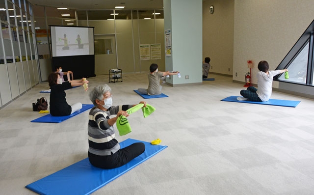 待望の再開で体操を楽しむ参加者=19日午前、市内東本町1のフォンジェ2階 (2020/06/19)