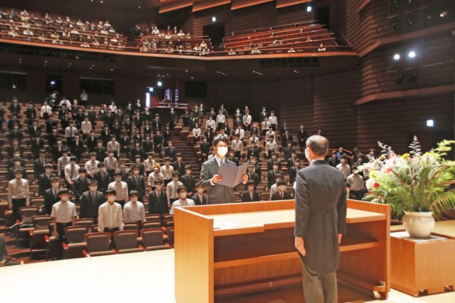 新型ウイルスの万全な対策の中で行われた新潟工科大入学式。誓いの言葉を述べる新入生代表の高橋さん=20日、アルフォーレ (2020/06/20)