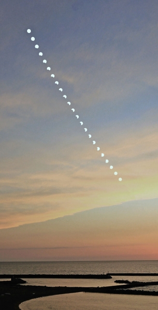 佐藤俊男さんによる部分日食の連続撮影。次第に欠けていく様子を5分間隔で撮影した=21日、市内番神2 (2020/06/22)