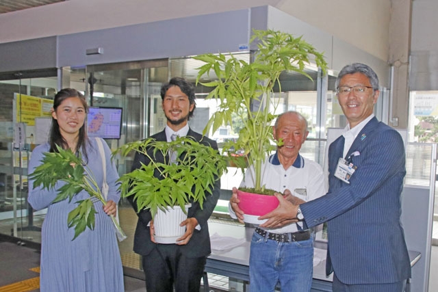桜井市長に米山トウキを寄贈した前畑彰洋さん(左から2人目)ら=23日、市役所正面玄関 (2020/06/23)