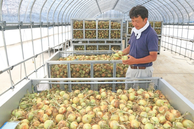 生産者から出荷され、選別を待つタマネギ。鉄製の大きなかごには400キロ入る=刈羽村刈羽、柏崎農協集荷選別場 (2018/06/22)