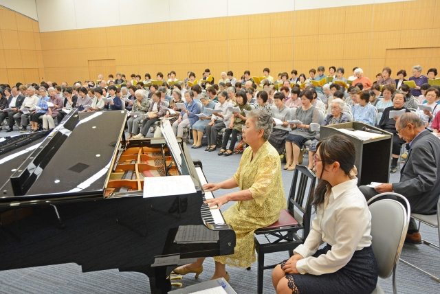 最終回になった野ばら会の「歌のつどい」。山田代表のピアノ伴奏で歌声を響かせた=23日、市民プラザ (2018/06/25)