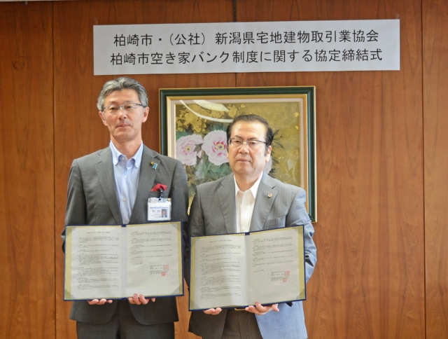 市と空き家バンク制度に関する協定を締結した小林正行・県宅地建物取引業協会副会長(右)=27日午前、市役所市長応接室  (2018/06/27)