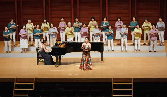 「コーラス枇杷の実」のコンサート。鷲尾さんのピアの伴奏で「柏崎ふるさと日和」を歌い上げた=24日、アルフォーレ・大ホール (2018/06/28)