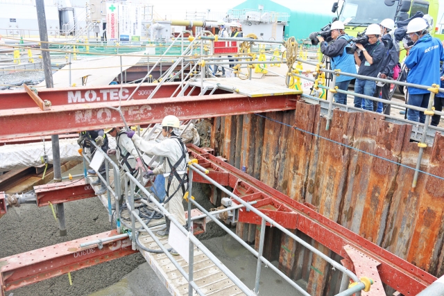 報道陣に公開された柏崎刈羽原発の取水路で行われている液状化対策工事=28日 (2018/06/29)