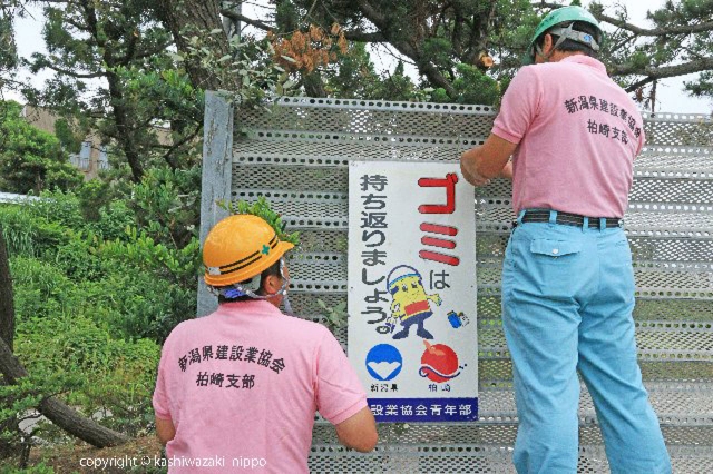 ごみの持ち帰りを呼び掛ける看板の取り付け=29日、東の輪海水浴場 (2018/06/30)