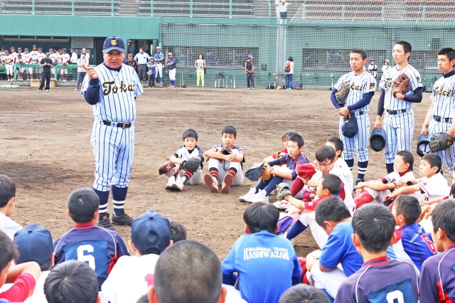 招待野球の関連イベントとして行った東海大相模高による野球教室。門馬監督(中央)や選手が小学生を指導した=9日、佐藤池球場 (2018/06/13)