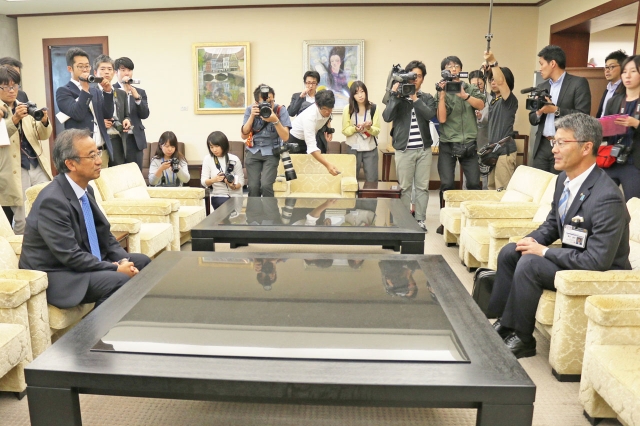 花角知事と面会し、三つの検証の見直しなどを求めた桜井市長(右)=14日午後、県庁 (2018/06/15)