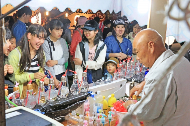 大勢でにぎわうえんま市。容器が光る電球ソーダは子どもたちに人気の一つだった=15日午後7時半ごろ、市内東本町1 (2018/06/16)
