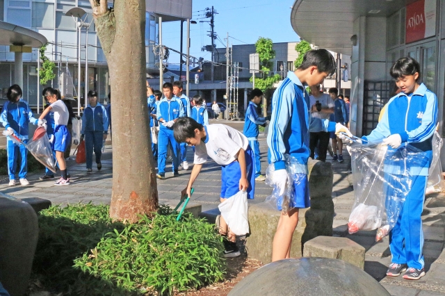 一中生徒会の呼び掛けで、保護者、地域の人らも参加した「えんま市清掃」=17日午前6時過ぎ (2018/06/18)