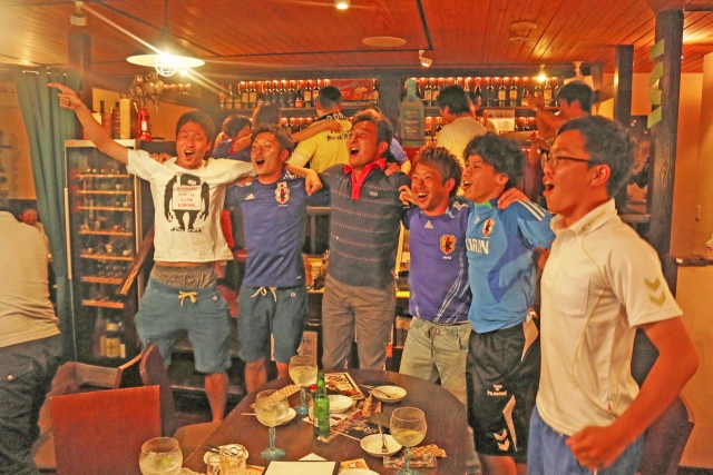 日本の勝利が決まり、肩を組んで喜ぶサポーターたち=19日夜、東本町1 (2018/06/20)