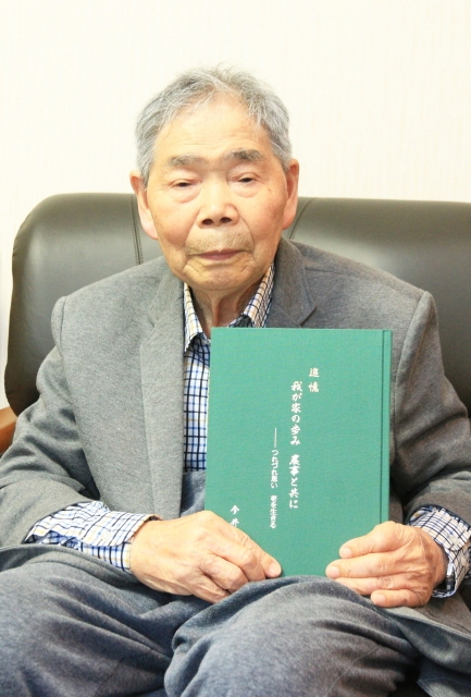 江戸時代からの家族の歴史、農業の変遷を著書にまとめた今井長栄さん=市内岩上 (2018/06/21)
