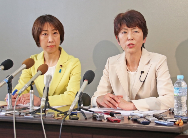 知事選に立候補の意向を表明した池田千賀子県議(右)と同席した菊田真紀子衆院議員=8日午後、県庁 (2018/05/09)