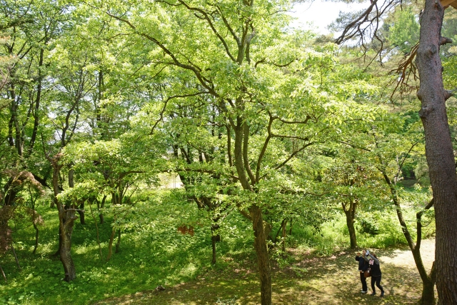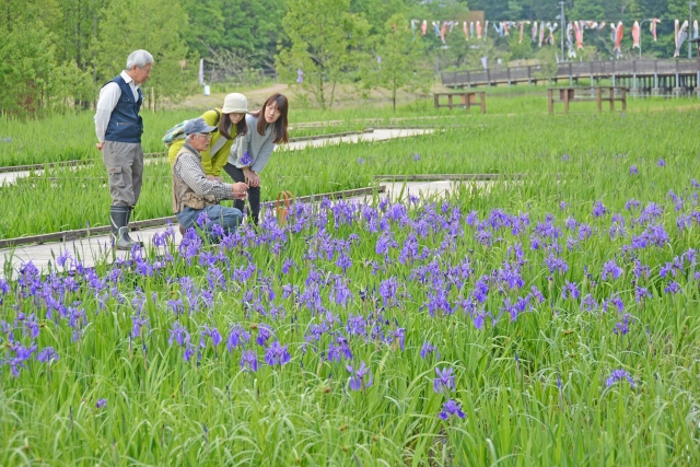 水辺を彩るカキツバタ。鮮やかな紫色の花が散策の人たちの足を止めた=12日午前、市内軽井川の柏崎・夢の森公園 (2018/05/12)
