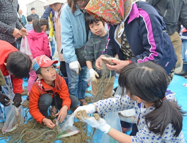 大漁旗が風になびく浜辺で開かれた恒例の「イワシまつり」。地元の人から魚の網外しを習う参加者=13日、荒浜漁港 (2018/05/14)