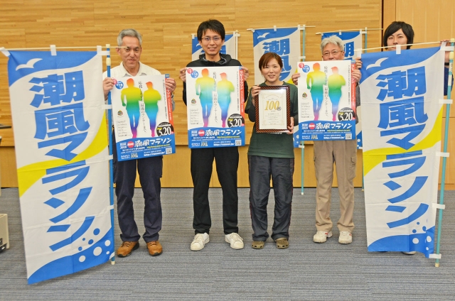今年の潮風マラソンを盛り上げるポスター、のぼり旗。新体制で全国からのランナーを迎える (2018/05/15)
