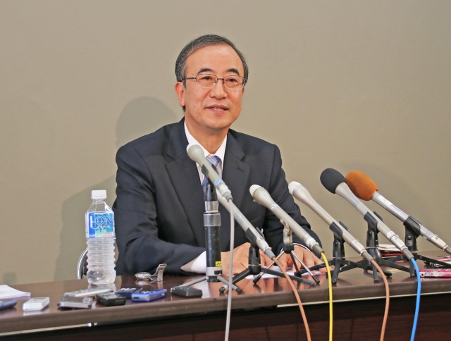 知事選へ立候補を表明した前海上保安庁次長の花角英世氏=15日午後、県庁 (2018/05/16)