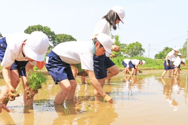 泥まみれになりながら手植えをした日吉小5年生=市内土合 (2018/05/17)