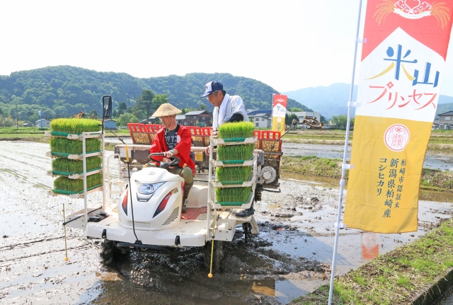 認証ブランド米「米山プリンセス」を目指し、田植えをする桜井市長=18日午前、市内野田 (2018/05/18)