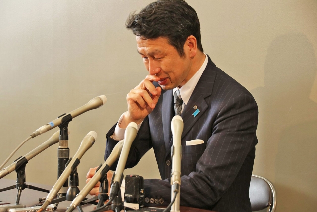 緊急記者会見で言葉を詰まらせる米山知事=17日午後1時半ごろ、県庁記者発表室