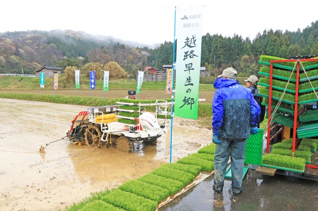 あいにくの雨の中で、県内一早い新米の出荷を目指し、早期栽培越路早生の田植え=18日午前、市内西山町浜忠
