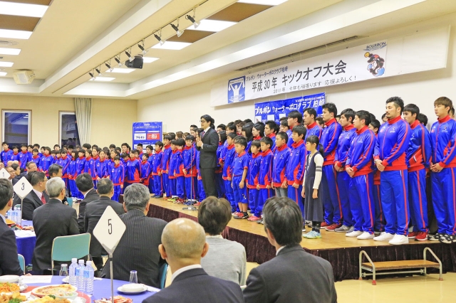 壇上であいさつする青柳総監督(中央)と所属全選手=18日、産文会館大ホール