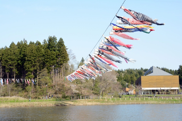 春風に舞い、大池を泳ぐこいのぼり=19日、夢の森公園 (2018/04/20)