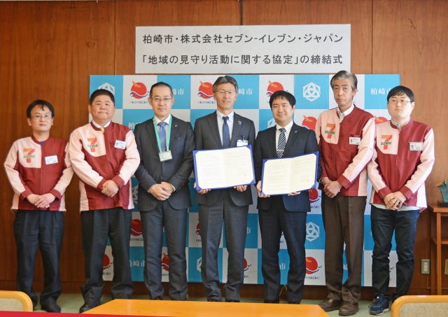 協定書に調印した桜井市長とセブン―イレブンの坂口マネジャー(右から3人目)ら=20日、市役所市長応接室
