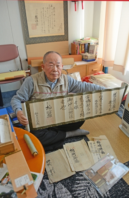 柏崎県関係などの貴重な資料を収集した高橋克英さん。後ろは、収集のきっかけになった「越後府」から交付された軸=市内半田1の自宅
