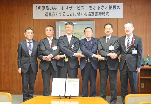 ふるさと納税の返礼品として、桜井市長と高齢者の「みまもりサービス」協定を締結した日本郵便の根立鯨波局長(右から3人目)ら=4日、市役所市長応接室 (2018/04/05)
